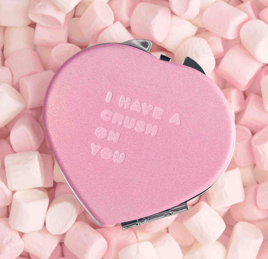 تزئین شده با پیام شایان ستایش "من عاشق تو هستم" آینه جمع و جور صورتی، ایده آل برای حمل با خود، حتی در یک کیف کوچک جا می شود.